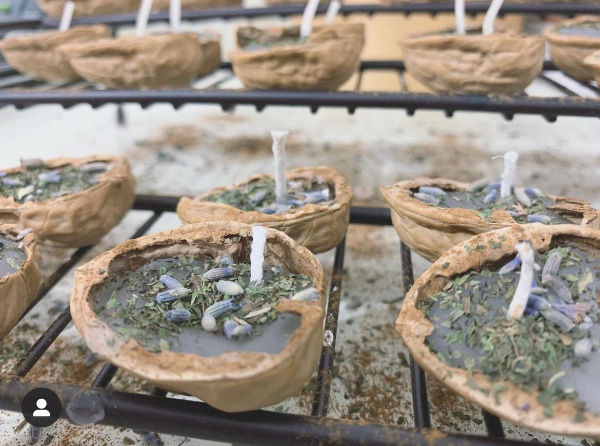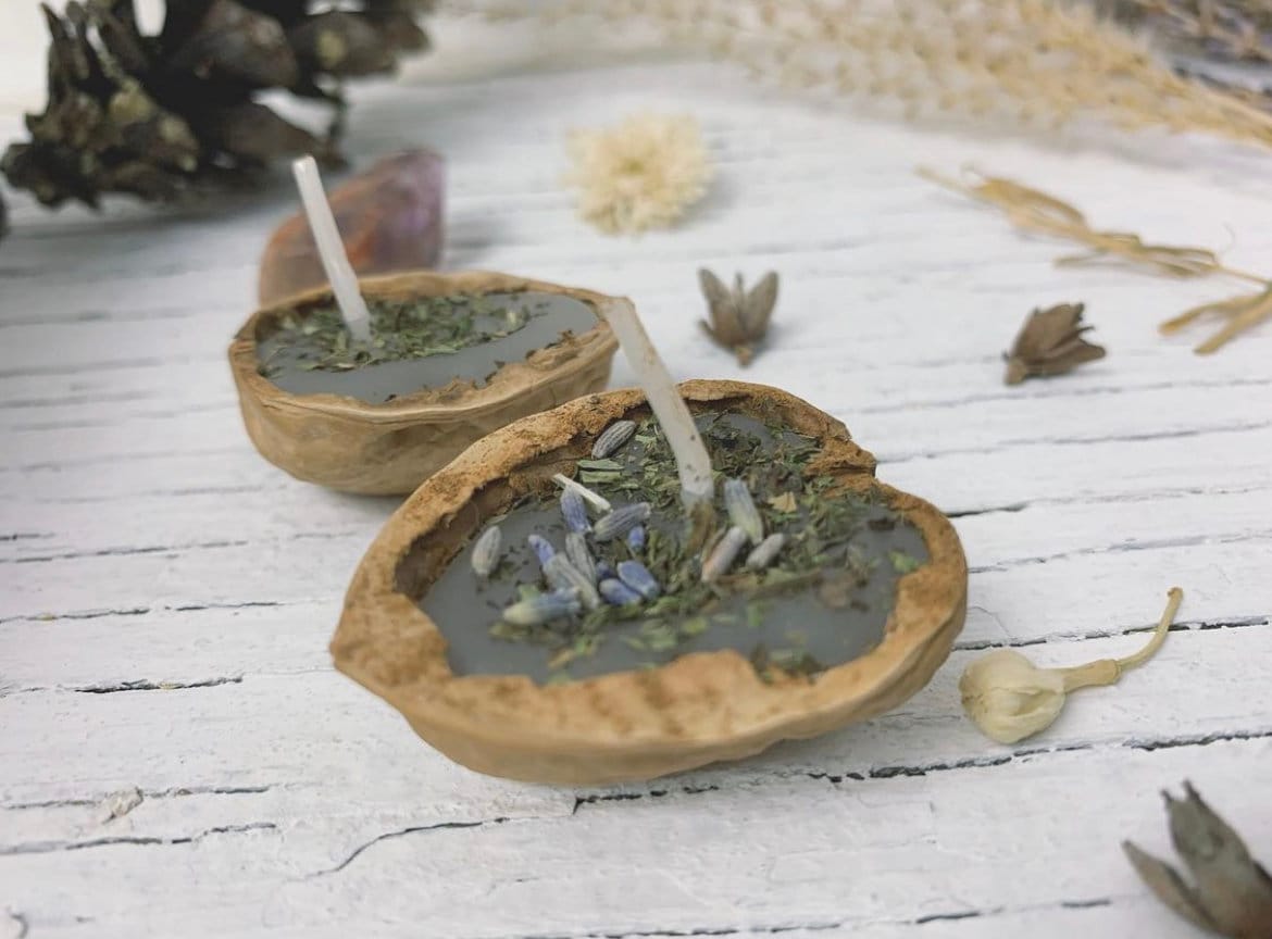 This unique set includes 6, 12, 24, 50 or 100 Handmade Natural Walnut candles with dried leaves & flowers.